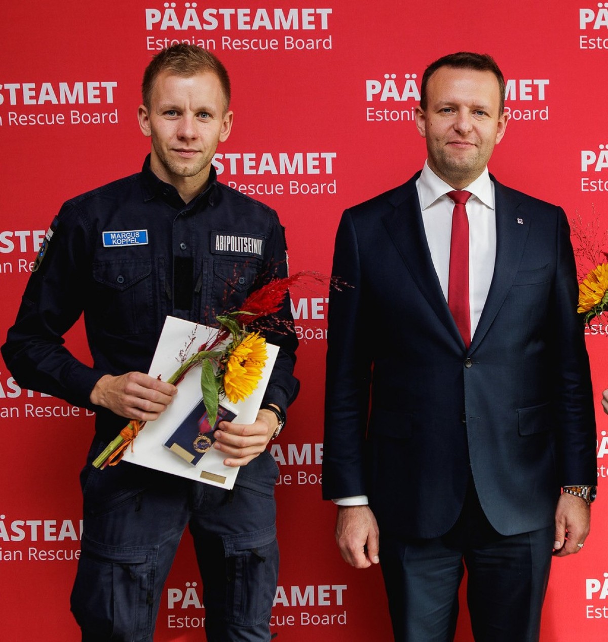 Foto 2: Margus Koppelit (vasakul) tunnustas siseminister Lauri Läänemets Päästeameti elupäästja III klassi medaliga. Foto: Rasmus Kooskora