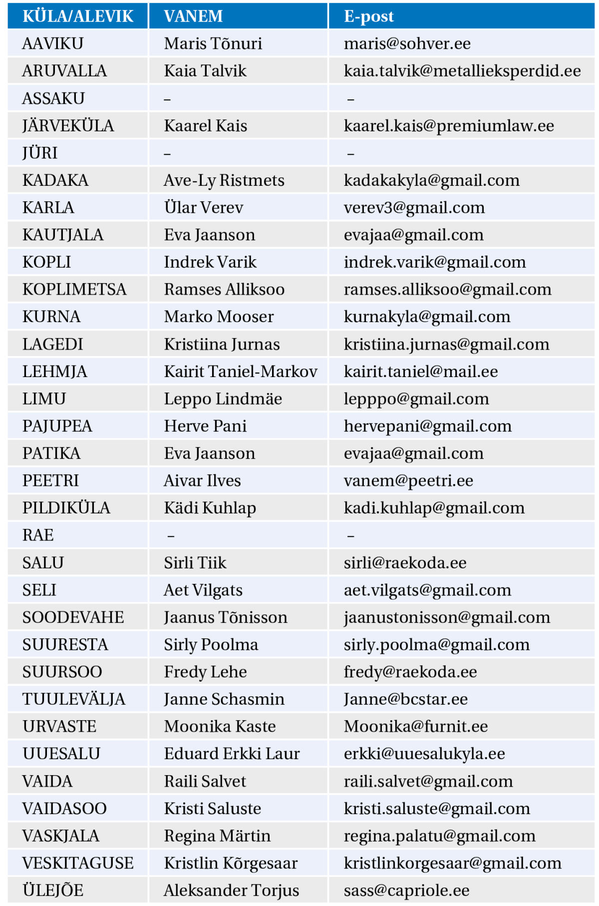 Kui soovid saada küla- või alevikuvanemaks, võta ühendust ametisoleva vanemaga või kui sinu külal-alevikul ei ole hetkel vanemat, siis Rae valla alevike ja külavanemate seltsi (RVAKS) juhatusega (e-post: juhatus@raekoda.ee).