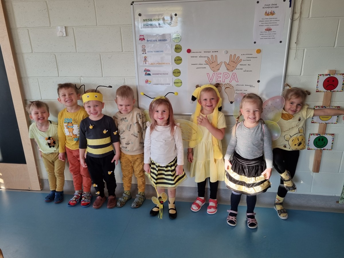 Kuid ega siis päev ainult mett süües ei möödunud! Kõikides rühmades viidi läbi meega seotud tegevusi, tutvustati lastele mee erinevaid omadusi, lahendati ristsõnu, joonistati meega seonduvaid pilte. Joonistustelt võis leida mesilasi ja mesitarusid, aga ka meepurke, maiaid mõmmikuid, nektarit täis lilleõisi, meega saiaviilu või piimaklaasi, kuhu oli segatud mett. Teadagi, sügisel tuleb ju kurgud terved hoida! Kõige toredamalt tähistas meepäeva meie Mesilindude rühm, seal olid isegi lapsed mesilindudeks muutunud! Õpetajate Kristi, Tiina ja Lidia sõnul on nende lastel parimad lapsevanemad, kes igasuguste väljakutsetega õhinal kaasa tulevad. Nii olidki lapsed saanud selga mesilastiivad ja kollase-mustaga kostüümid. Kuna rühmas on lapsi alates kaheaastastest, siis räägiti lahti kõige tähtsamad põhitõed mesilaste ning mee kohta. Näiteks kuidas tee sisse saab suhkru asemel mett panna ja kui tervislik see on. Eks mesinike eesmärgiks ongi selle traditsiooniga viia lasteni teadmist mee kasulikkusest ning mesilaste tähtsusest.