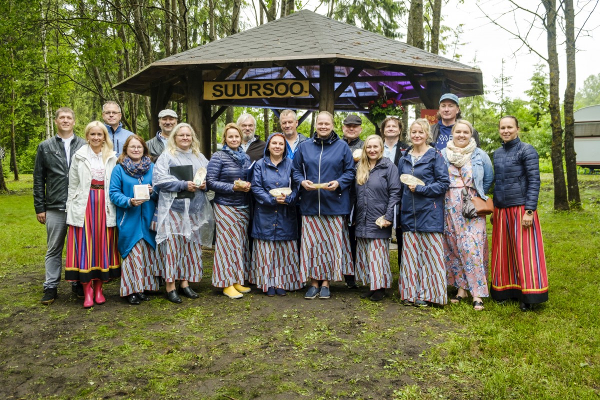 Pildil 1: Vallavanem Madis Sarik, abivallavanem Bärbel Salumäe, Suursoo külavanem Fredy Lehe, ürituse peakorraldajad Annika Aas, Gerli Lehe ning Patika külakoor. Foto: Ott Kattel