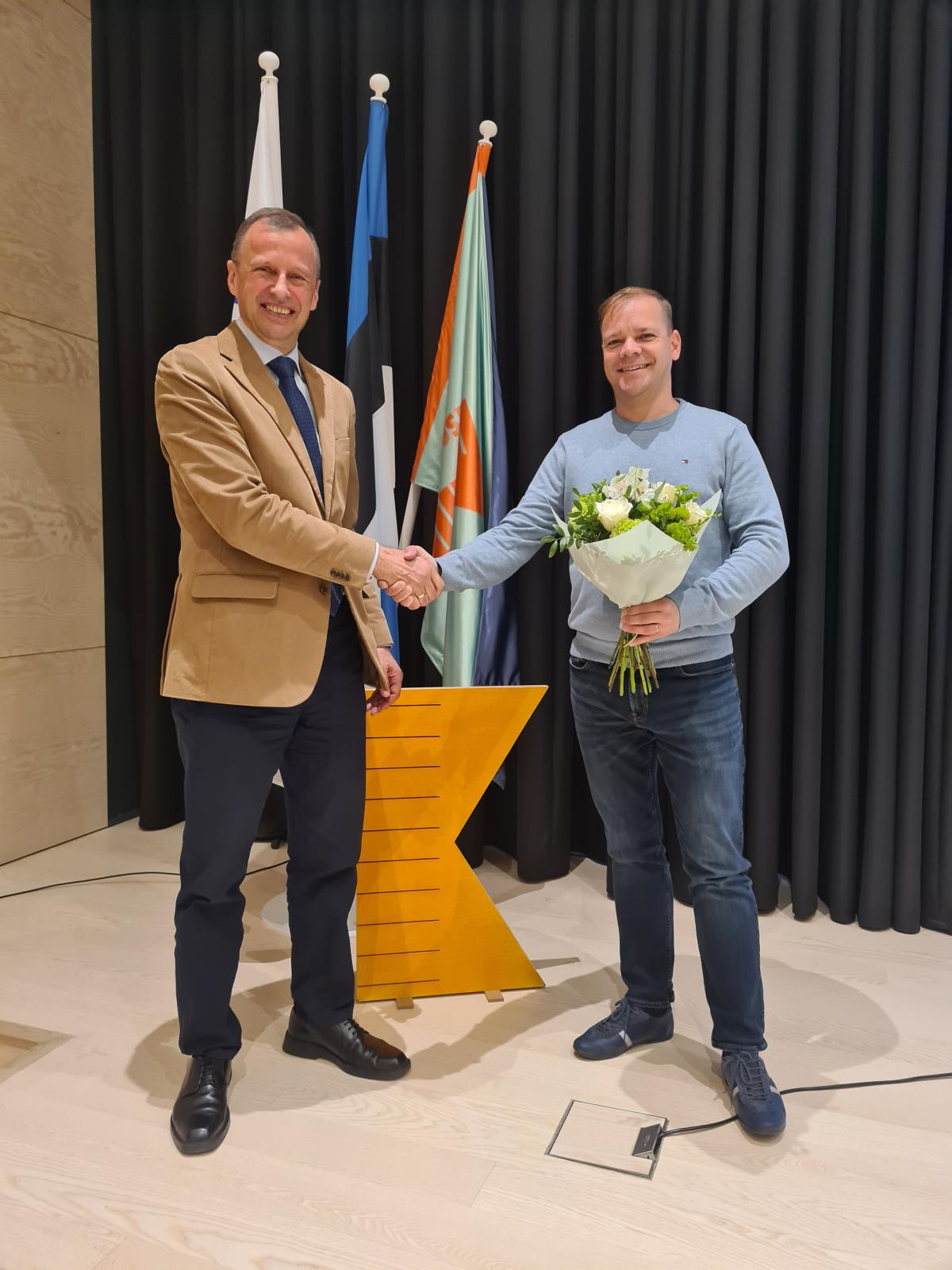 Tõnis Kõivu (vasakul) õnnitleb pärast abivallavanemaks valimist volikogu aseesimees Tanel Tammela. Foto: erakogu