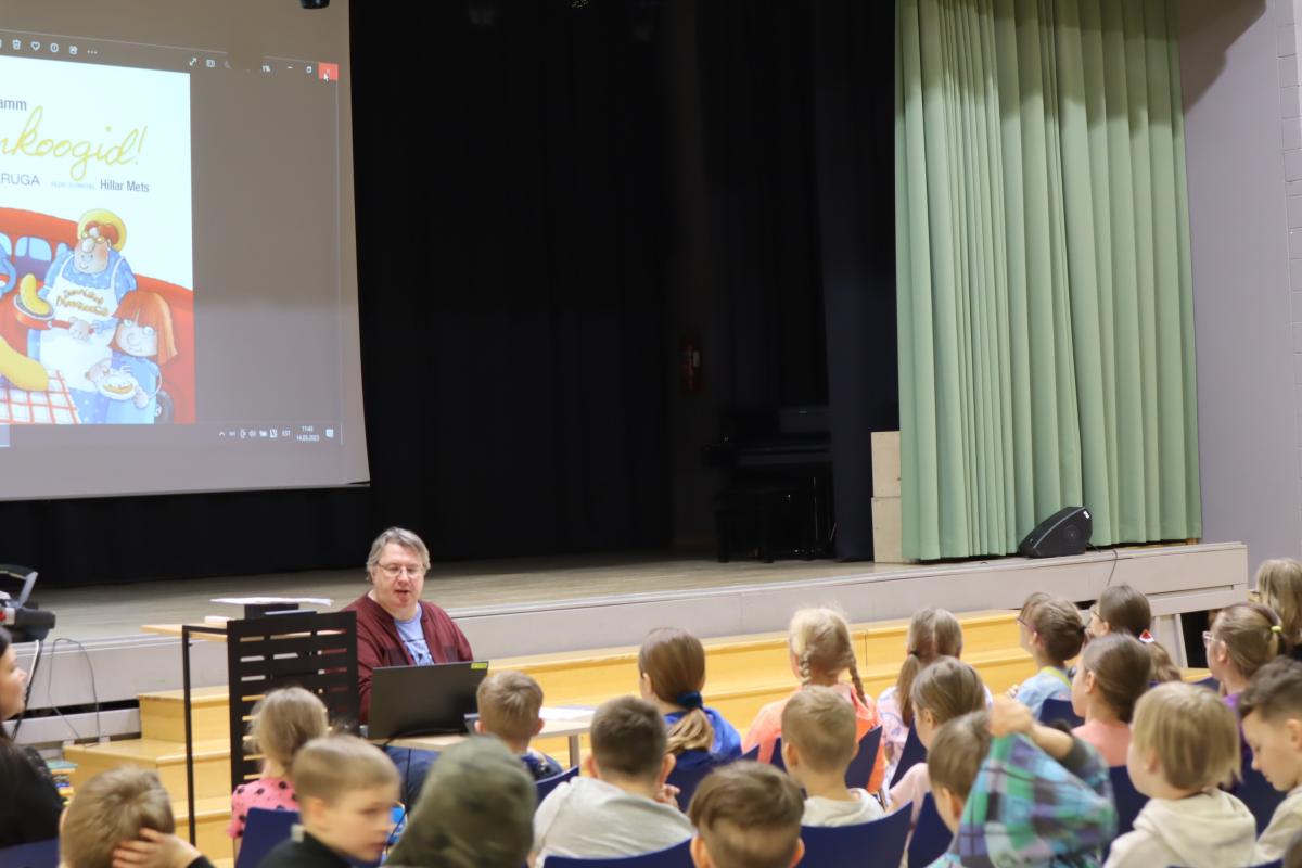 2023. aasta emakeelenädalal kohtusid lapsed kirjanik Markus Saksatammega. Foto: erakogu.