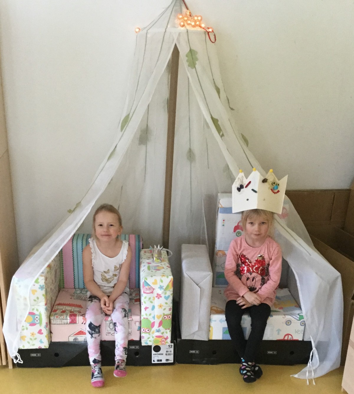 Väga palju tegime ühismeisterdusi, mis õpetas koostööd ning planeerimist. Näiteks ehitasime korrusmaja, kus oma päriskodu korrusenumbrile meisterdas iga laps enda „kodu“. Teine suurem ühistöö oli liikluslinnaku ehitamine koos liiklusvahendite ja liiklusmärkidega. Valmisid ka kuninga ja kuninganna troonid muinasjuttude lavastamiseks. Mõne aja möödudes oli näha, kuidas laste fantaasia tööle hakkas, kui nad meie materjalilaos ringi vaatasid. Kui projekti alguses oskasid lapsed WC-paberi tühjale rullile vaid silmi kleepida, siis jaanuari lõpupoole olid lastel valmis linnud, lennukid, printsessid, robotid, laevad juba enne materjalilaost rühma tagasi jõudmist.