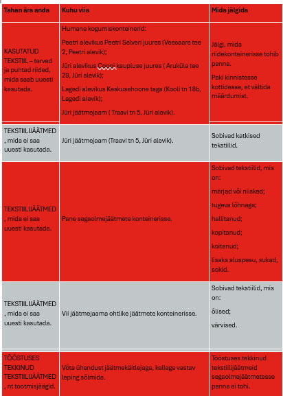 Kui riided, jalanõud või muud tekstiilid ei ole enam kasutuskõlblikud, tuleb need viia tekstiilijäätmete kogumiskohta, näiteks jäätmejaama, avalikku konteinerisse või kogumisringile. Vaata täpsemat infot tekstiilijäätmete ära andmise kohta Rae vallas juuresolevast tabelist.
