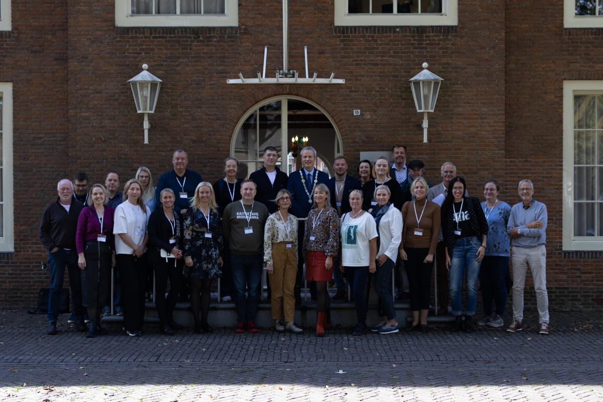 Foto: Hilvarenbeeki linnavalitsuse ees. Rae valla kogukondade delegatsiooni kuulusid: Veiko ja Anu Parts Aaviku külast; Gerli ja Fredy Lehe Suursoo külast ning Bärbel Salumäe ja Kristiina Jurnas Lagedi alevikust. Foto: erakogu.