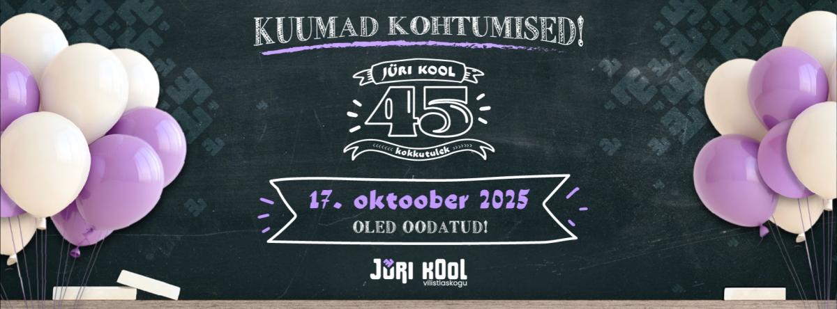 Jüri kooli 45. aastapäev ja vilistlaste kokkutulek saab kulminatsiooni 17. oktoobril õhtuse peoga „KUUMAD KOHTUMISED!“ Jüri pallihallis. Peo programm algab täpselt kell 19. Soovitame koguneda juba varem, uksed on avatud alates kell 18.