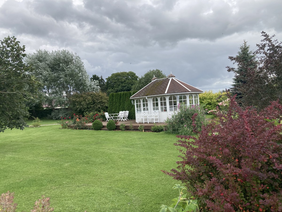 Kolmveerand hektaril laiuva pargi keskel laiub kaitseingli tiibade kujuga väljapaistev lehis. Viljapuudest on aias neli õuna- ja üks ploomipuu, mis rikkalikku saaki annavad. Armastusest aia ja seal sirguvate taimede vastu räägib ilmekalt üks hiljutine lugu. Nimelt murdus kevadtormi tagajärjel pooleks punase kastanipuu tüvi. Peeter ei läinud lihtsama vastupanu teed, vaid segas kokku savi, lehmasõnniku ja vee ning tegi viga saanud kohale teksariidest mähise. „Operatsioonist“ taastumine kulgeb plaanipäraselt.