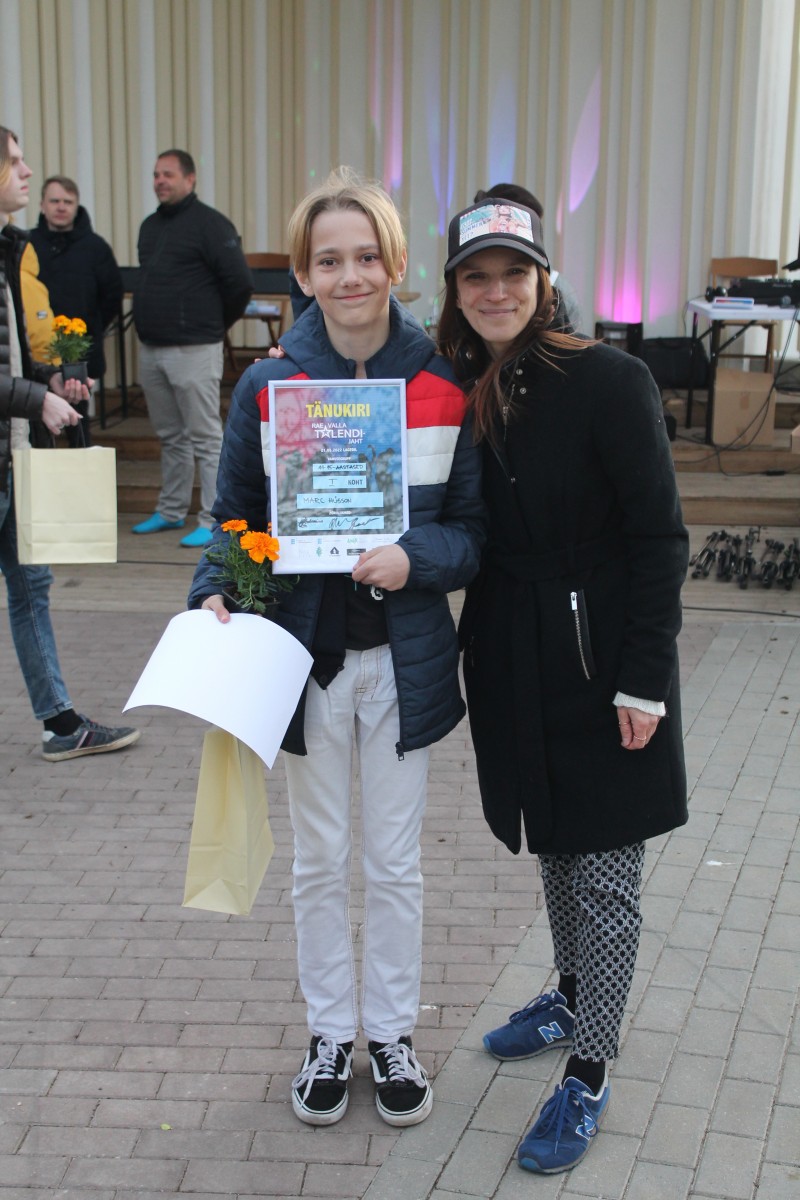 Pildil 1: 11–15-aastaste kategooria võitja Marc Hüsson ja Vaida alevikuvanem Raili Salvet