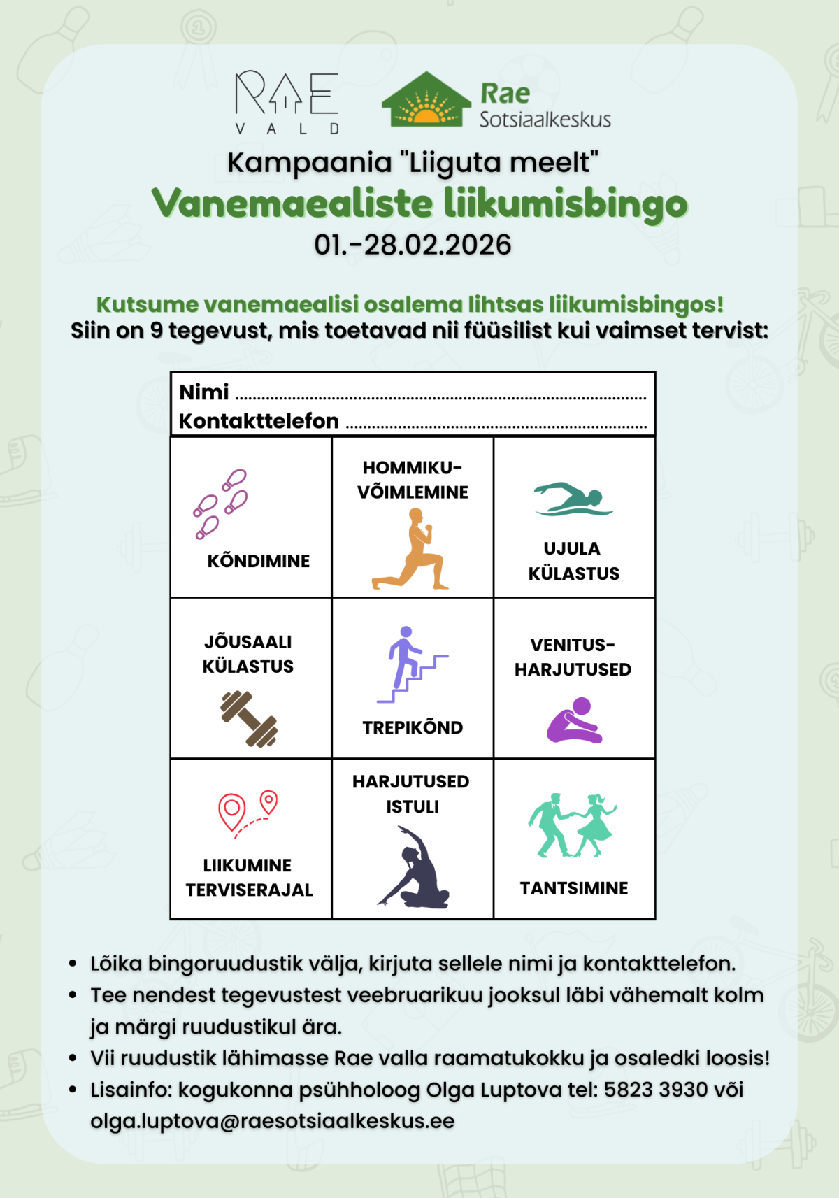 Kampaania tegevuste kohta leiate täpsemat infot valla kodulehelt www.rae.ee, valides menüüst Kultuur, sport ja kogukonnad → Vaba aeg → Liiguta meelt kampaania.