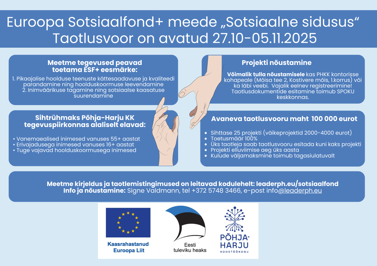 Meetme kaudu rahastatakse väga erinevaid algatusi, olgu selleks õpitoad, tervist edendavad tegevused või silmaringi avardavad ja suhtlemist võimaldavad väljasõidud. Toetuse suurus on 2000–8000 eurot ning toetusmäär 100%. Esimene taotlusvoor toimus tänavu jaanuaris, järgmine taotlusvoor avaneb juba sügisel ehk 27.10 – 05.11.2025. Rohkem infot toetusmeetme kohta Põhja-Harju Koostöökogu koduleheküljel leaderph.eu/sotsiaalfond.