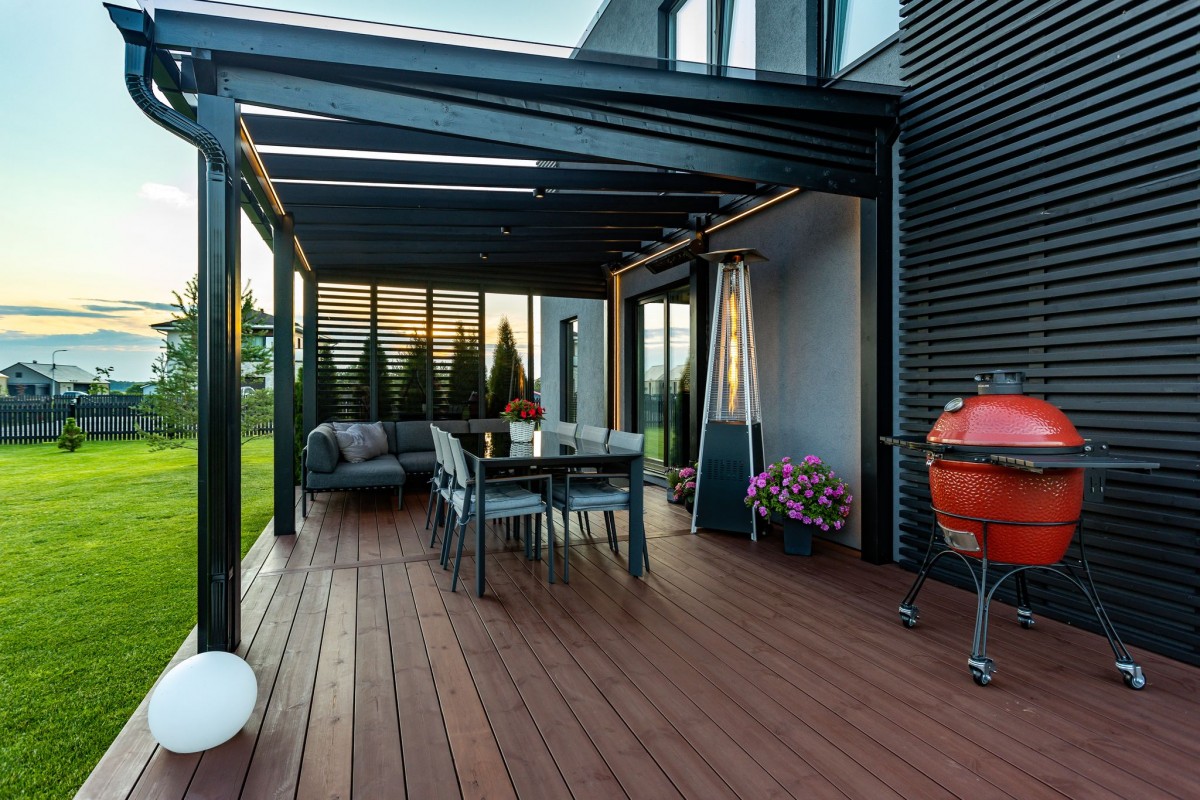 Läbimõeldult on ehitatud ka terrass, kus saab mõnusalt aega veeta nii soojal suveõhtul kui ka miinuskraadidega. Talvel aitavad hubase meeleolu loomisele kaasa soojuskiirgur ja läbimõeldud valgustus. Selleks, et ka suurem seltskond end lahedalt tunneks, lasti terrass suuremaks ehitada ja algsed nn laiatarbe terrassilauad asendati jalasõbralikuma termotöödeldud puidust valmistatud laudadega.