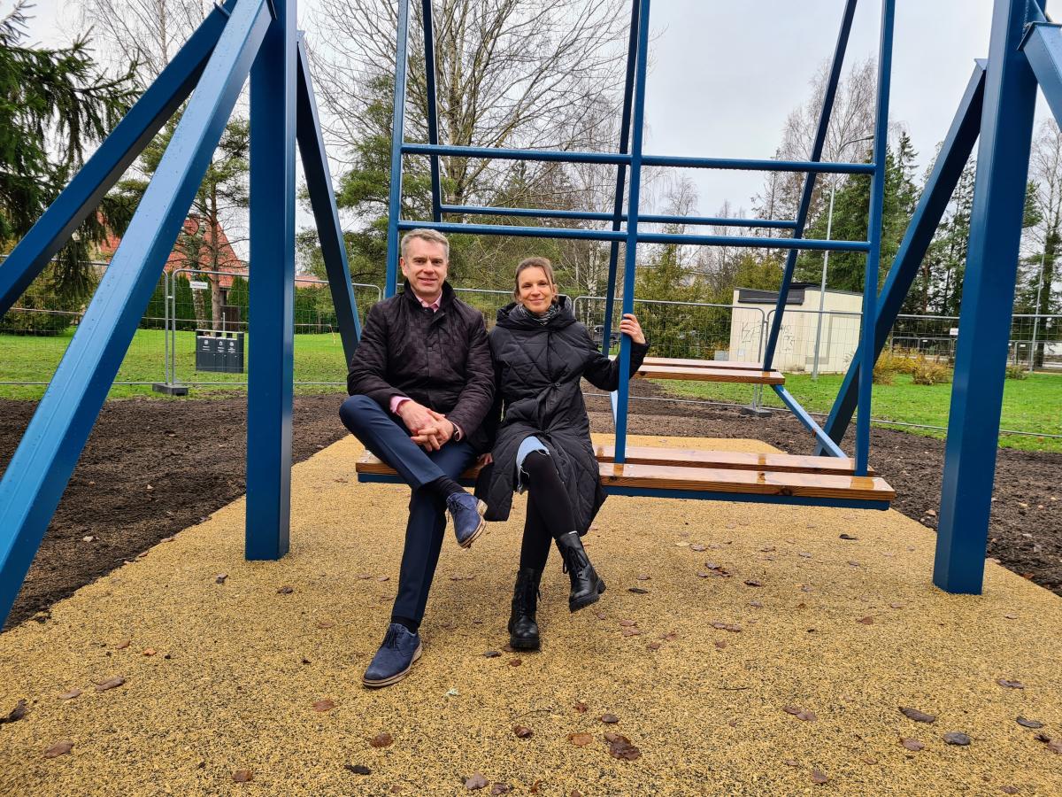 Vastvalminud Vaida alevikuplats. Külakiigel Tarmo Gutmanniga koos alevikuvanem Raili Salvet. Foto: erakogu