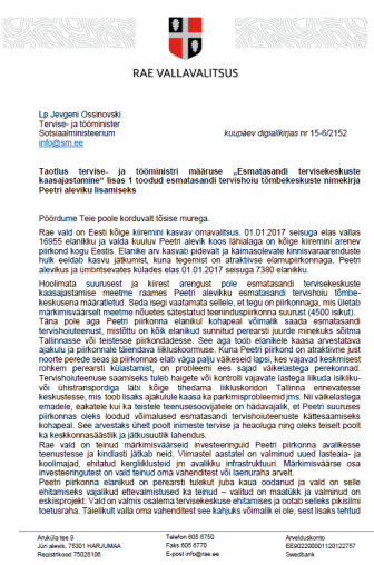 Lp Jevgeni OssinovskiTervise- ja tööminister Sotsiaalministeerium kuupäev digiallkirjas nr 15-6/2152info@sm.ee Taotlus tervise- ja tööministri määruse „Esmatasandi tervisek...